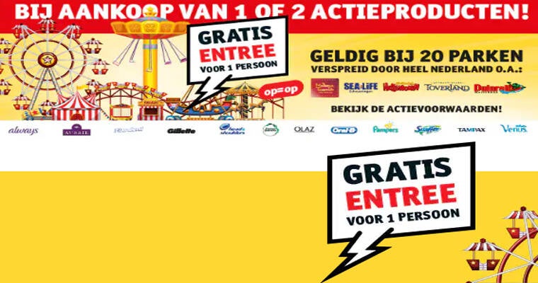 ✔ bij aankoop van 1 of 2 geselecteerde producten van Always, Aussie, Fixodent, Gillette, Head & Shoulders, Herbal Essences, Olaz, Oral-B, Pampers, Swiffer, Tampax en Venus