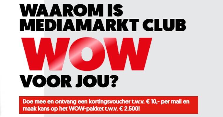 ✔ Media Markt wil graag weten waarom MediaMarkt Club WOW voor je is, in maximaal 60 karakters. Je inzending wordt getoond op de wall-of-WOW en daarmee maak je kans op de hoofdprijs; een WOW-pakket t.w.v. € 2.500,-. Bovendien ontvang je als Clublid een kortingsvoucher t.w.v. €10